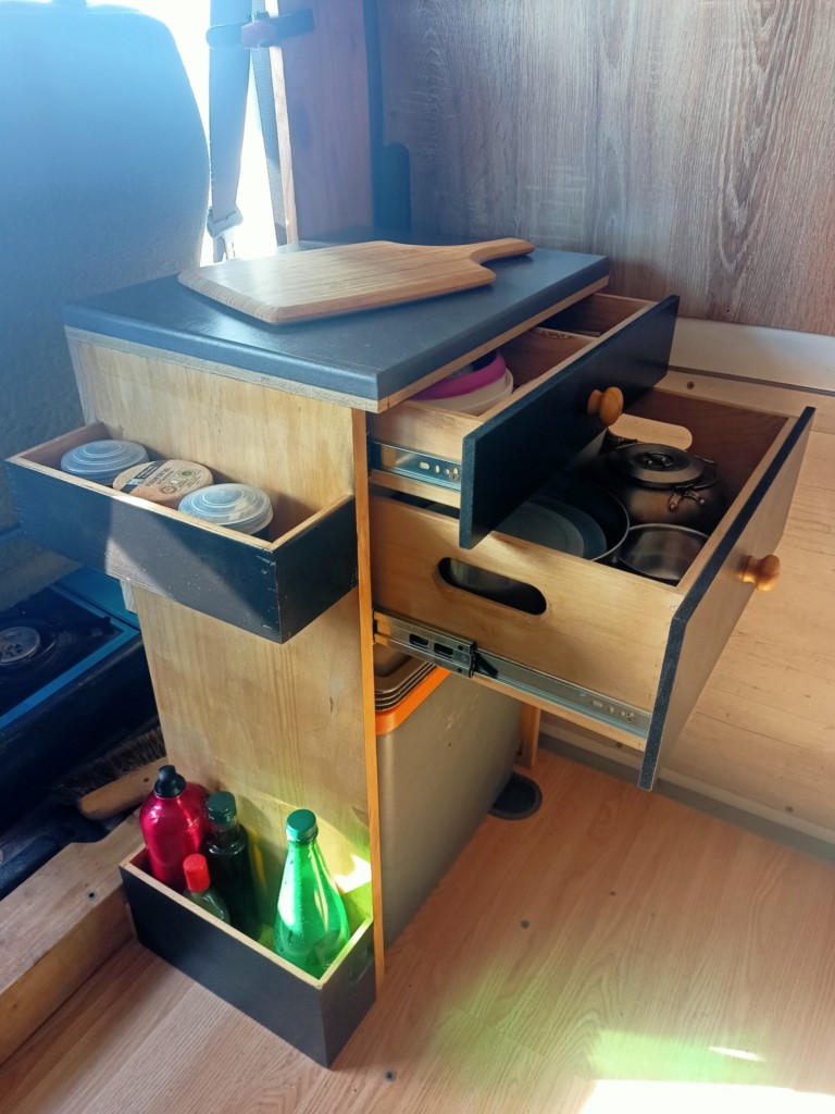 Meuble "Cuisine" compact pour van, les tiroirs font 30cmx20cm l'un en 15cm de hauteur pour casseroles et accessoires + l'autre de 10cm de hauteur pour assiettes et couverts.. sur le coté un range bouteille en bas et un porte épices en haut. Un grand emplacement sous les tiroirs pour une glacière 12v standard ou une poubelle standard (possibilité d'utiliser cet emplacement pour des tiroirs supplémentaires moyennant surplus)